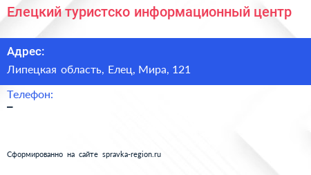 Елецкий туристско-информационный центр по адресу Липецкая область, Елец, Мира, 121 в дальнейшем Организация, размещена в следующих категориях: