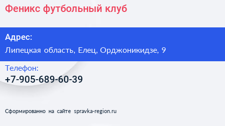 Феникс, футбольный клуб по адресу Липецкая область, Елец, Орджоникидзе, 9 в дальнейшем Организация, размещена в следующих категориях: