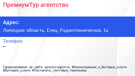 ПремиумТур, агентство по адресу Липецкая область, Елец, Радиотехническая, 1а в дальнейшем Организация, размещена в следующих категориях: