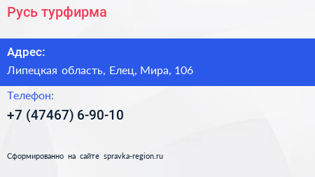 Русь, турфирма по адресу Липецкая область, Елец, Мира, 106 в дальнейшем Организация, размещена в следующих категориях: