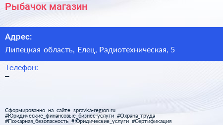 Рыбачок, магазин по адресу Липецкая область, Елец, Радиотехническая, 5 в дальнейшем Организация, размещена в следующих категориях:
