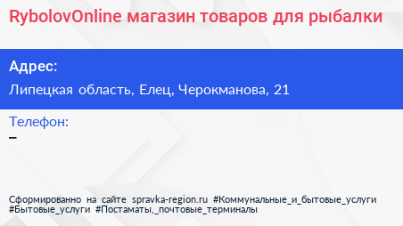 RybolovOnline, магазин товаров для рыбалки по адресу Липецкая область, Елец, Черокманова, 21 в дальнейшем Организация, размещена в следующих категориях:
