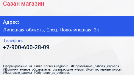 Сазан, магазин по адресу Липецкая область, Елец, Новолипецкая, 3к в дальнейшем Организация, размещена в следующих категориях: