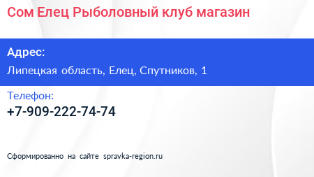 Сом Елец, Рыболовный клуб-магазин по адресу Липецкая область, Елец, Спутников, 1 в дальнейшем Организация, размещена в следующих категориях: