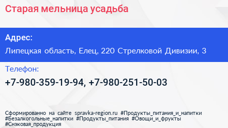 Старая мельница, усадьба по адресу Липецкая область, Елец, 220 Стрелковой Дивизии, 3 в дальнейшем Организация, размещена в следующих категориях: