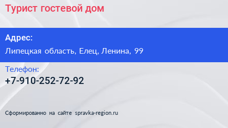 Турист, гостевой дом по адресу Липецкая область, Елец, Ленина, 99 в дальнейшем Организация, размещена в следующих категориях: