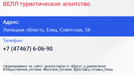 ВЕЛЛ, туристическое агентство по адресу Липецкая область, Елец, Советская, 58 в дальнейшем Организация, размещена в следующих категориях:
