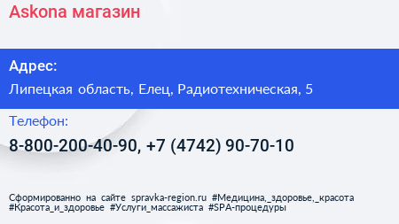 Askona, магазин по адресу Липецкая область, Елец, Радиотехническая, 5 в дальнейшем Организация, размещена в следующих категориях:
