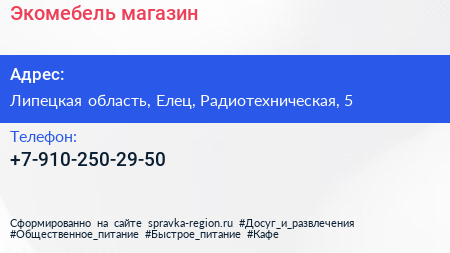 Экомебель, магазин по адресу Липецкая область, Елец, Радиотехническая, 5 в дальнейшем Организация, размещена в следующих категориях: