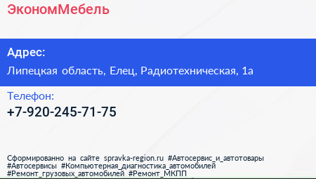 ЭкономМебель по адресу Липецкая область, Елец, Радиотехническая, 1а в дальнейшем Организация, размещена в следующих категориях: