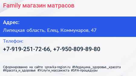 Family, магазин матрасов по адресу Липецкая область, Елец, Коммунаров, 47 в дальнейшем Организация, размещена в следующих категориях: