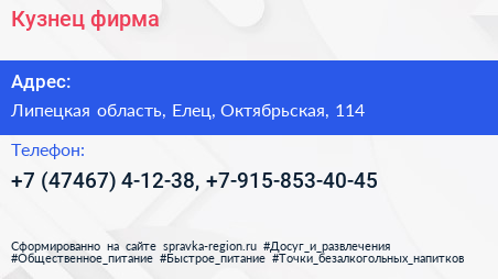 Кузнец, фирма по адресу Липецкая область, Елец, Октябрьская, 114 в дальнейшем Организация, размещена в следующих категориях: