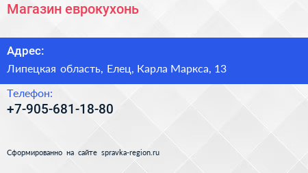 Магазин еврокухонь по адресу Липецкая область, Елец, Карла Маркса, 13 в дальнейшем Организация, размещена в следующих категориях: