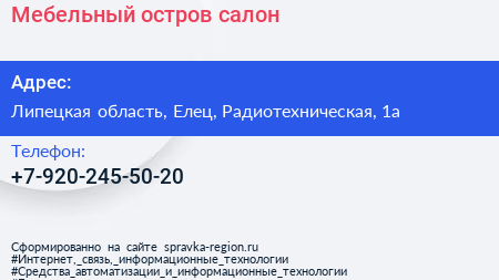 Мебельный остров, салон по адресу Липецкая область, Елец, Радиотехническая, 1а в дальнейшем Организация, размещена в следующих категориях: