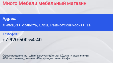 Много Мебели, мебельный магазин по адресу Липецкая область, Елец, Радиотехническая, 1а в дальнейшем Организация, размещена в следующих категориях: