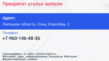 Приоритет, ателье мебели по адресу Липецкая область, Елец, Королёва, 1 в дальнейшем Организация, размещена в следующих категориях:
