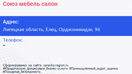 Союз-мебель, салон по адресу Липецкая область, Елец, Орджоникидзе, 96 в дальнейшем Организация, размещена в следующих категориях: