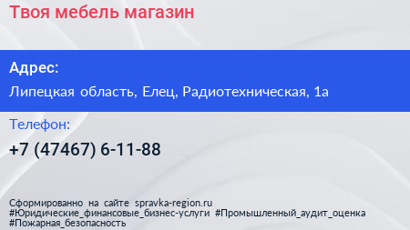 Твоя мебель, магазин по адресу Липецкая область, Елец, Радиотехническая, 1а в дальнейшем Организация, размещена в следующих категориях: