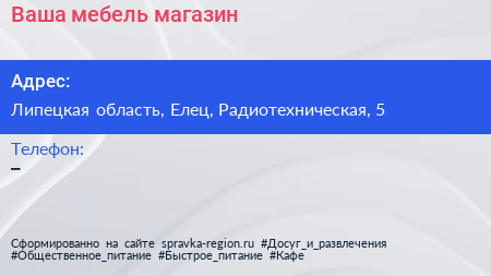 Ваша мебель, магазин по адресу Липецкая область, Елец, Радиотехническая, 5 в дальнейшем Организация, размещена в следующих категориях: