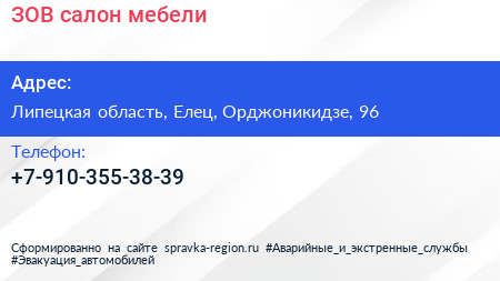 ЗОВ, салон мебели по адресу Липецкая область, Елец, Орджоникидзе, 96 в дальнейшем Организация, размещена в следующих категориях: