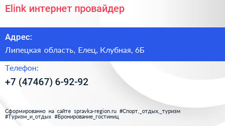 Elink, интернет-провайдер по адресу Липецкая область, Елец, Клубная, 6Б в дальнейшем Организация, размещена в следующих категориях: