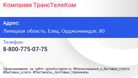 Компания ТрансТелеКом по адресу Липецкая область, Елец, Орджоникидзе, 80 в дальнейшем Организация, размещена в следующих категориях: