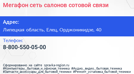 Мегафон, сеть салонов сотовой связи по адресу Липецкая область, Елец, Орджоникидзе, 40 в дальнейшем Организация, размещена в следующих категориях: