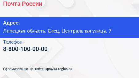 Почта России по адресу Липецкая область, Елец, Центральная улица, 7 в дальнейшем Организация, размещена в следующих категориях: