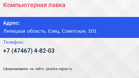 Компьютерная лавка по адресу Липецкая область, Елец, Советская, 101 в дальнейшем Организация, размещена в следующих категориях:
