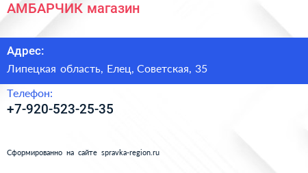 АМБАРЧИК, магазин по адресу Липецкая область, Елец, Советская, 35 в дальнейшем Организация, размещена в следующих категориях: