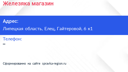 Железяка, магазин по адресу Липецкая область, Елец, Гайтеровой, 6 к1 в дальнейшем Организация, размещена в следующих категориях: