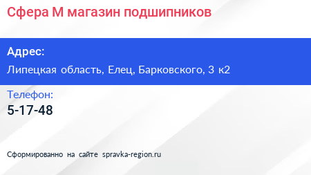 Сфера-М, магазин подшипников по адресу Липецкая область, Елец, Барковского, 3 к2 в дальнейшем Организация, размещена в следующих категориях: