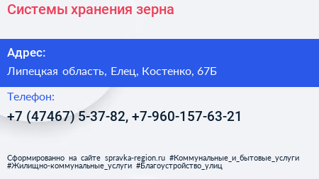 Системы хранения зерна по адресу Липецкая область, Елец, Костенко, 67Б в дальнейшем Организация, размещена в следующих категориях: