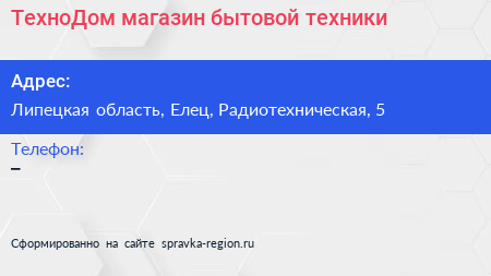 ТехноДом, магазин бытовой техники по адресу Липецкая область, Елец, Радиотехническая, 5 в дальнейшем Организация, размещена в следующих категориях: