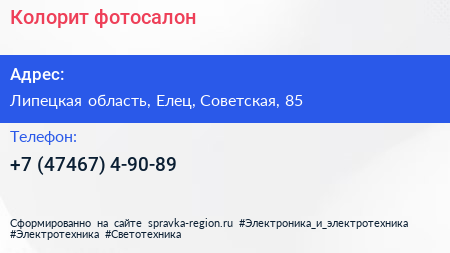 Колорит, фотосалон по адресу Липецкая область, Елец, Советская, 85 в дальнейшем Организация, размещена в следующих категориях: