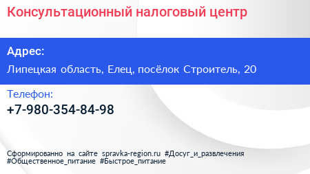 Консультационный налоговый центр по адресу Липецкая область, Елец, посёлок Строитель, 20 в дальнейшем Организация, размещена в следующих категориях: