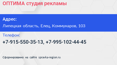 ОПТИМА, студия рекламы по адресу Липецкая область, Елец, Коммунаров, 103 в дальнейшем Организация, размещена в следующих категориях: