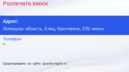 Роспечать, киоск по адресу Липецкая область, Елец, Кротевича, 27Б киоск в дальнейшем Организация, размещена в следующих категориях: