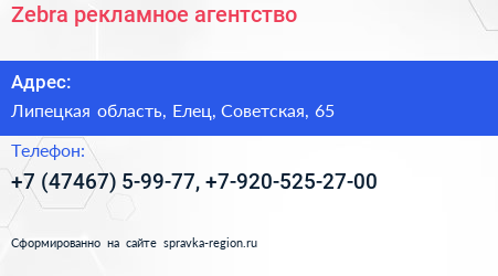 Zebra, рекламное агентство по адресу Липецкая область, Елец, Советская, 65 в дальнейшем Организация, размещена в следующих категориях: