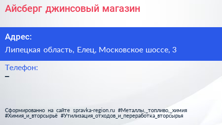 Айсберг, джинсовый магазин по адресу Липецкая область, Елец, Московское шоссе, 3 в дальнейшем Организация, размещена в следующих категориях: