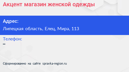 Акцент, магазин женской одежды по адресу Липецкая область, Елец, Мира, 113 в дальнейшем Организация, размещена в следующих категориях: