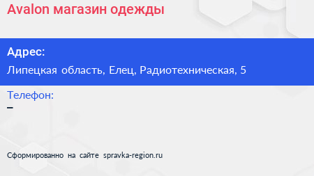 Avalon, магазин одежды по адресу Липецкая область, Елец, Радиотехническая, 5 в дальнейшем Организация, размещена в следующих категориях: