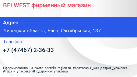 BELWEST, фирменный магазин по адресу Липецкая область, Елец, Октябрьская, 137 в дальнейшем Организация, размещена в следующих категориях: