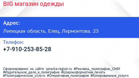 BIG, магазин одежды по адресу Липецкая область, Елец, Лермонтова, 23 в дальнейшем Организация, размещена в следующих категориях: