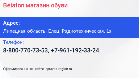 Belaton, магазин обуви по адресу Липецкая область, Елец, Радиотехническая, 1а в дальнейшем Организация, размещена в следующих категориях: