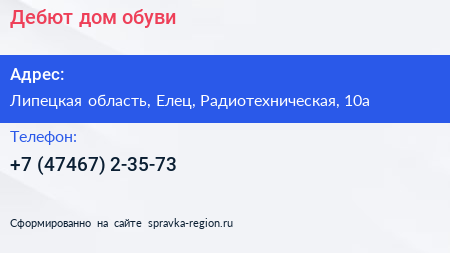 Дебют, дом обуви по адресу Липецкая область, Елец, Радиотехническая, 10а в дальнейшем Организация, размещена в следующих категориях: