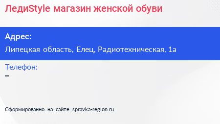 ЛедиStyle, магазин женской обуви по адресу Липецкая область, Елец, Радиотехническая, 1а в дальнейшем Организация, размещена в следующих категориях: