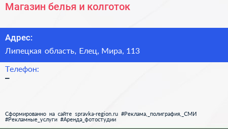 Магазин белья и колготок по адресу Липецкая область, Елец, Мира, 113 в дальнейшем Организация, размещена в следующих категориях:
