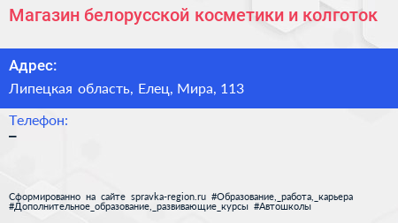 Магазин белорусской косметики и колготок по адресу Липецкая область, Елец, Мира, 113 в дальнейшем Организация, размещена в следующих категориях: