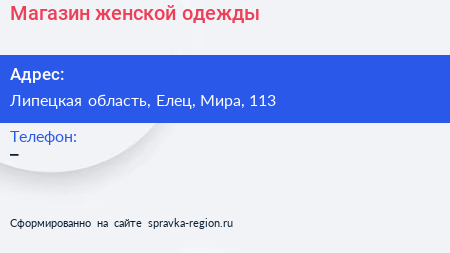 Магазин женской одежды по адресу Липецкая область, Елец, Мира, 113 в дальнейшем Организация, размещена в следующих категориях: